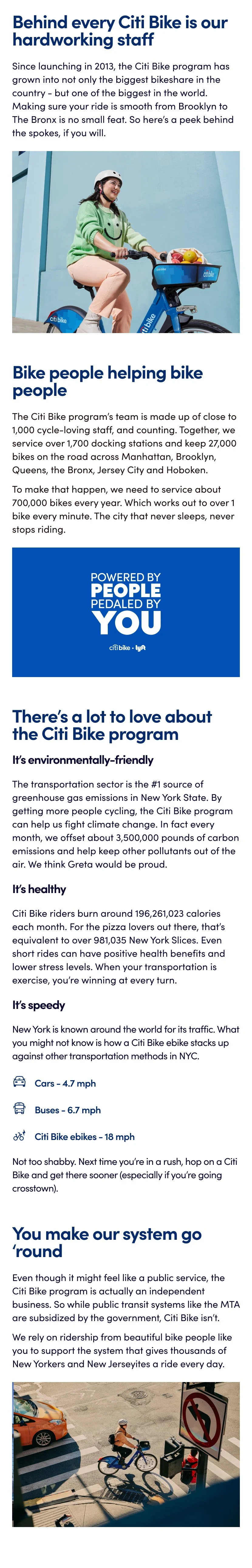 We were tasked with humanizing this essential NYC transportation service, with creative that shows the impressive people and data behind the spokes. With a budget shaped like a bike tire, we produced playful OLVs leveraging a mix of b-roll footage from past campaigns and run-and-gun footage our team captured on the ground in New York. To ensure a familiar look and feel, we modelled our supers after the UX in the Citi Bike app. We rounded out the creative with a blog post and an email, reminding riders that they play an important role in keeping the city and the program in motion.